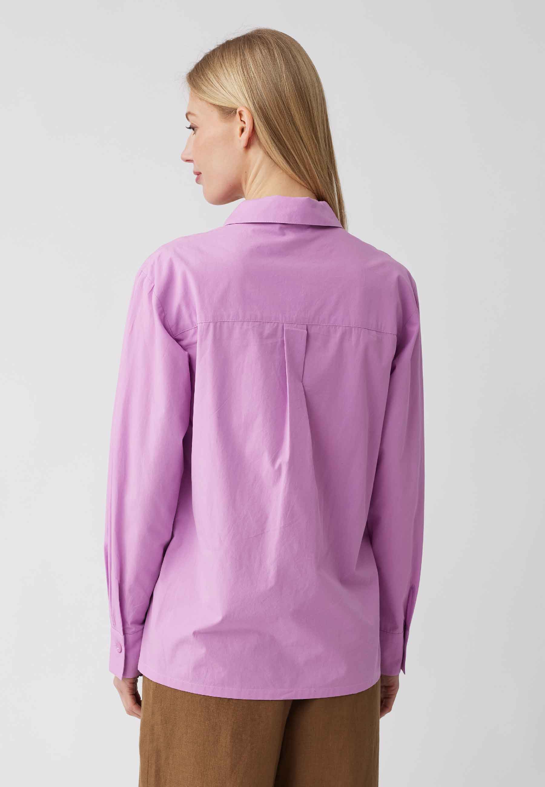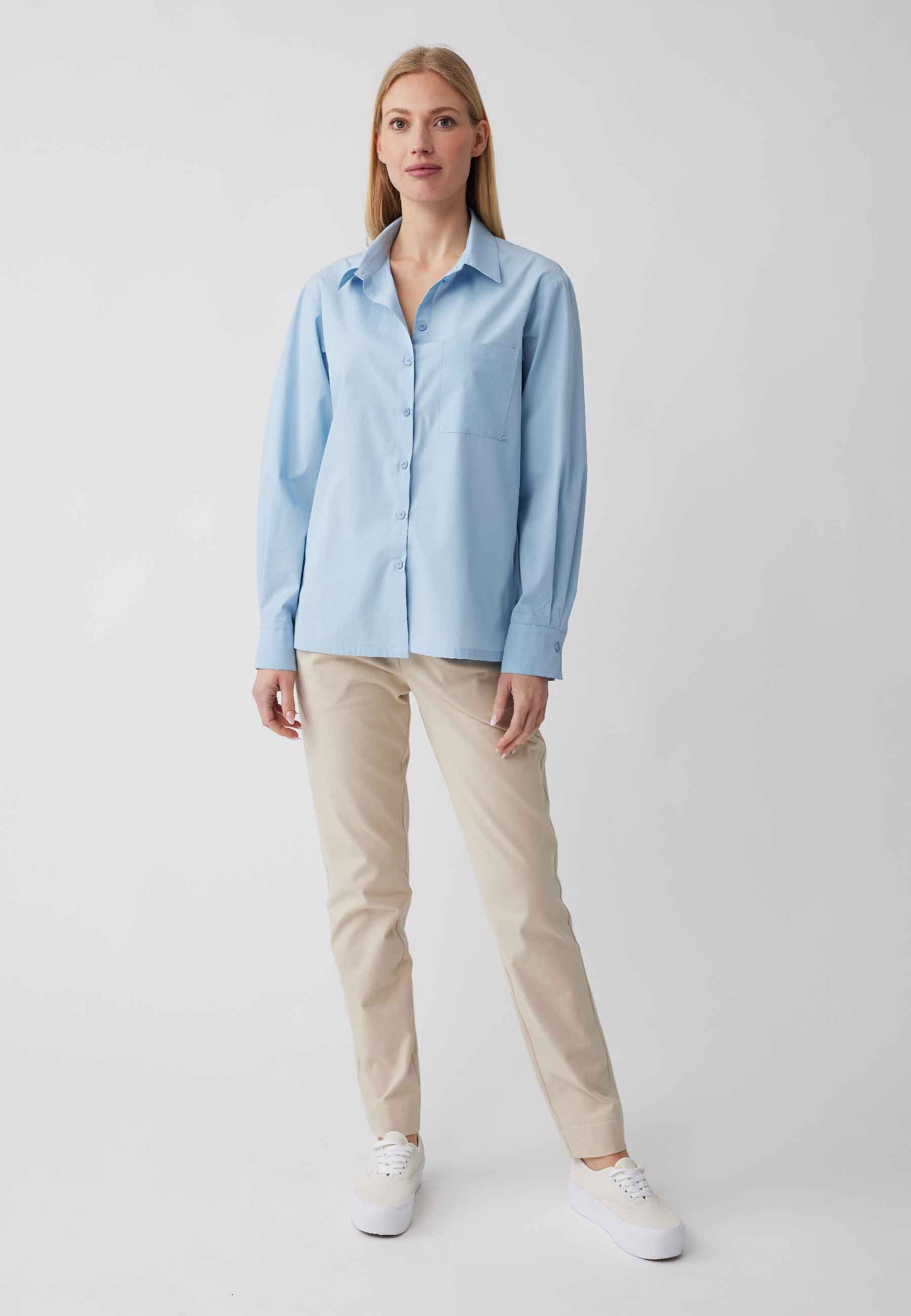 Bluse Cecilia aus reiner Bio-Baumwolle ist mit dem klassischen Hemdkragen, der kantigen Brusttasche und den breiten Ärmelmanschetten ein zeitloser Klassiker in lässiger Schnittführung. Diese Hemdbluse für viele Gelegenheiten sollte in keinem Schrank fehlen.