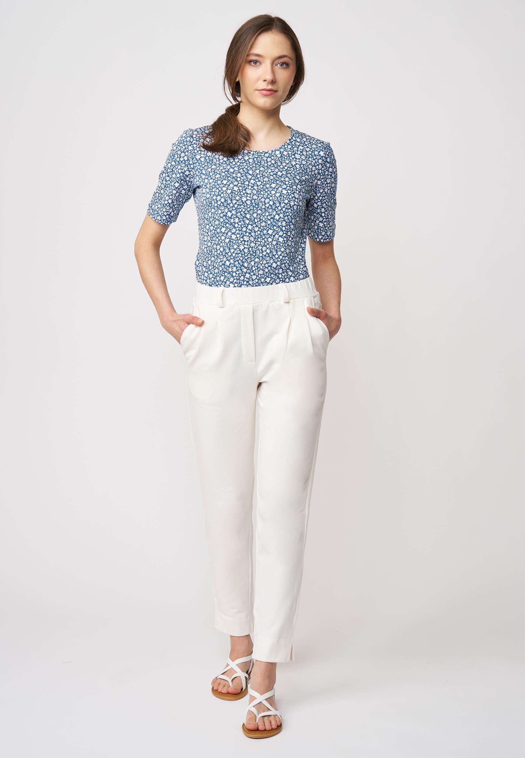 Die mittlere Bundhöhe und das schmal zulaufende, aber nicht enge Bein verleihen Utta eine ausgewogene Passform, die den Körper umspielt, ohne aufzutragen. Dadurch lässt sie sich sowohl lässig mit Shirt als auch stilvoll mit Bluse oder feinem Strick kombinieren – ideal für Alltag, Büro oder sommerliche Anlässe.