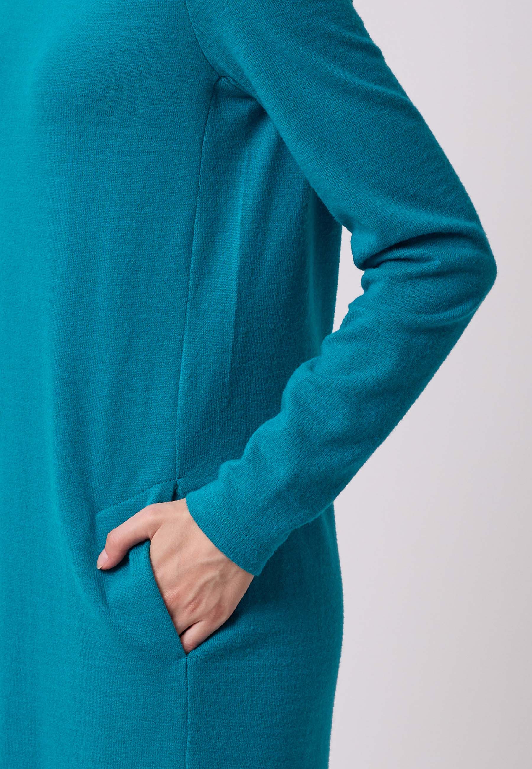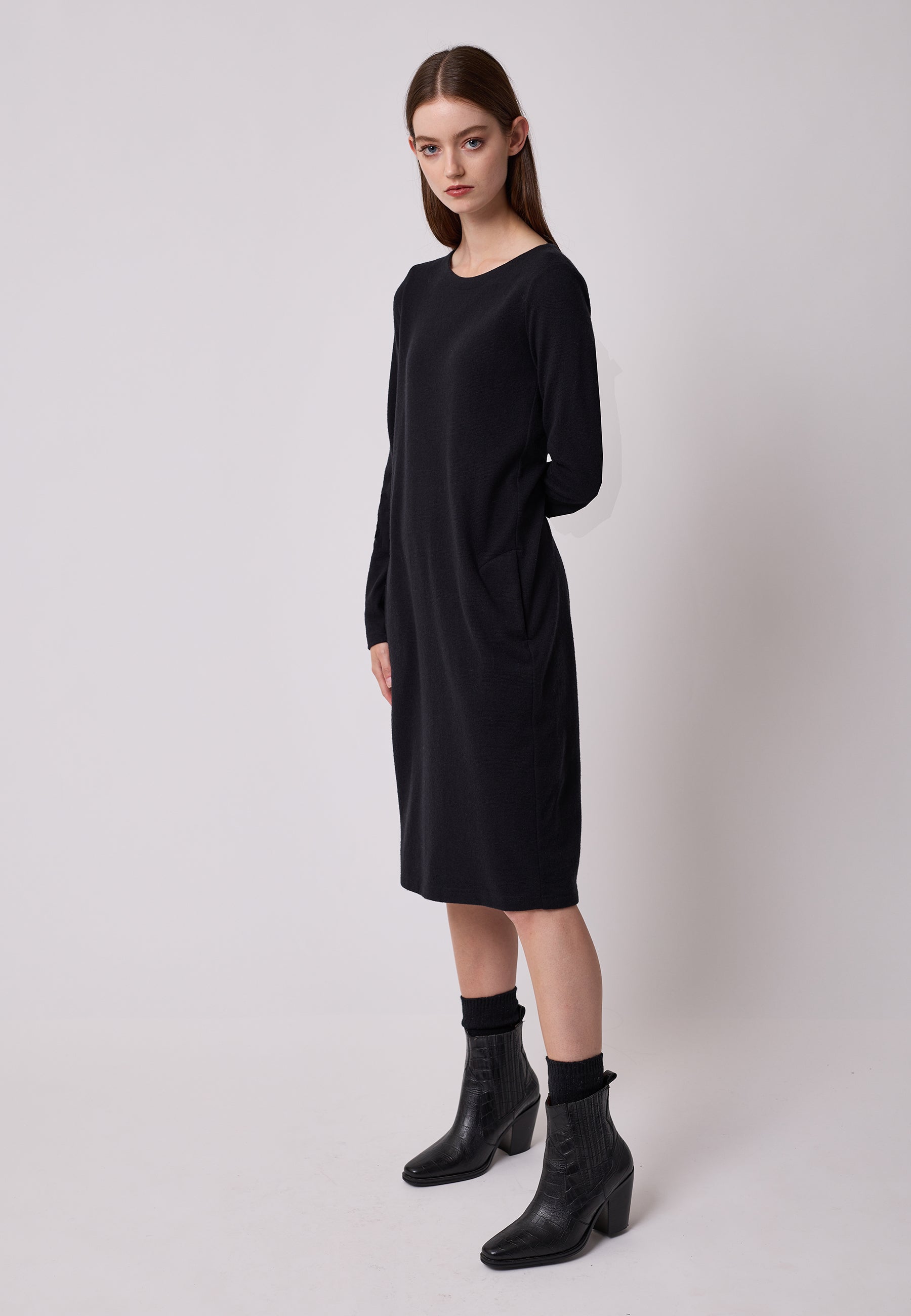 Mara ist ein zeitlos geschnittenes Kleid in einer leichten A-Linie. Die vorverlegten Seitennähte verbergen praktische Eingriffstaschen und erzeugen eine optisch schmale Silhouette.