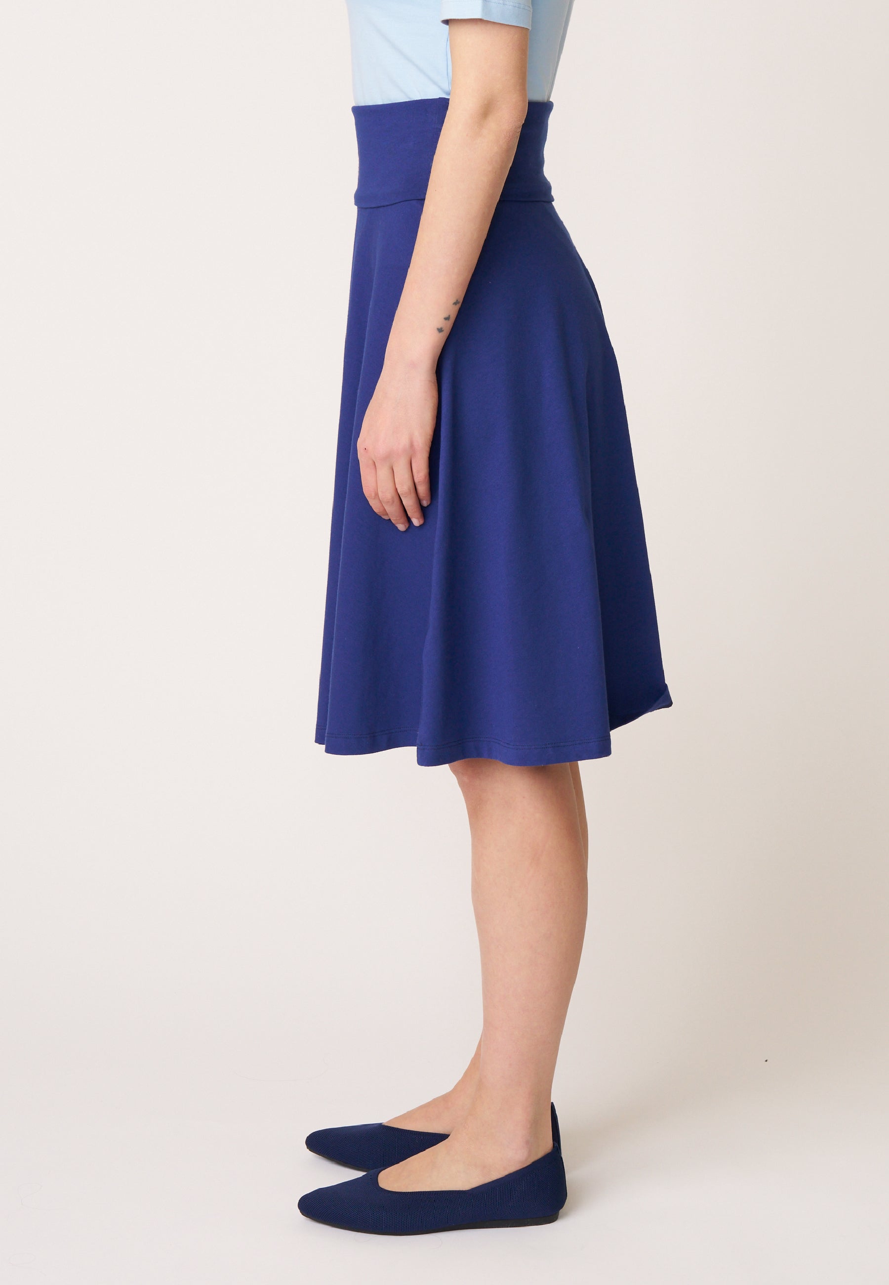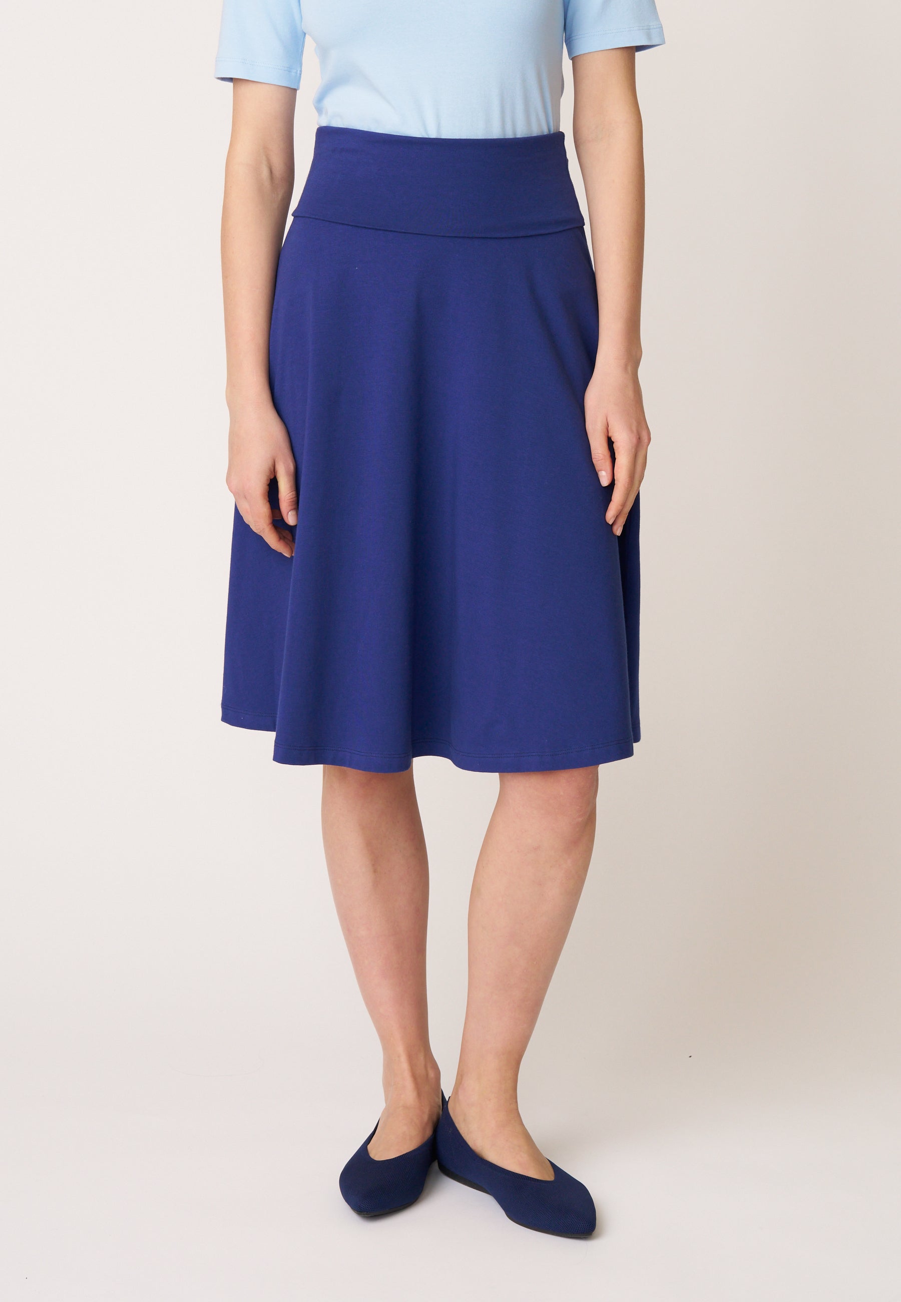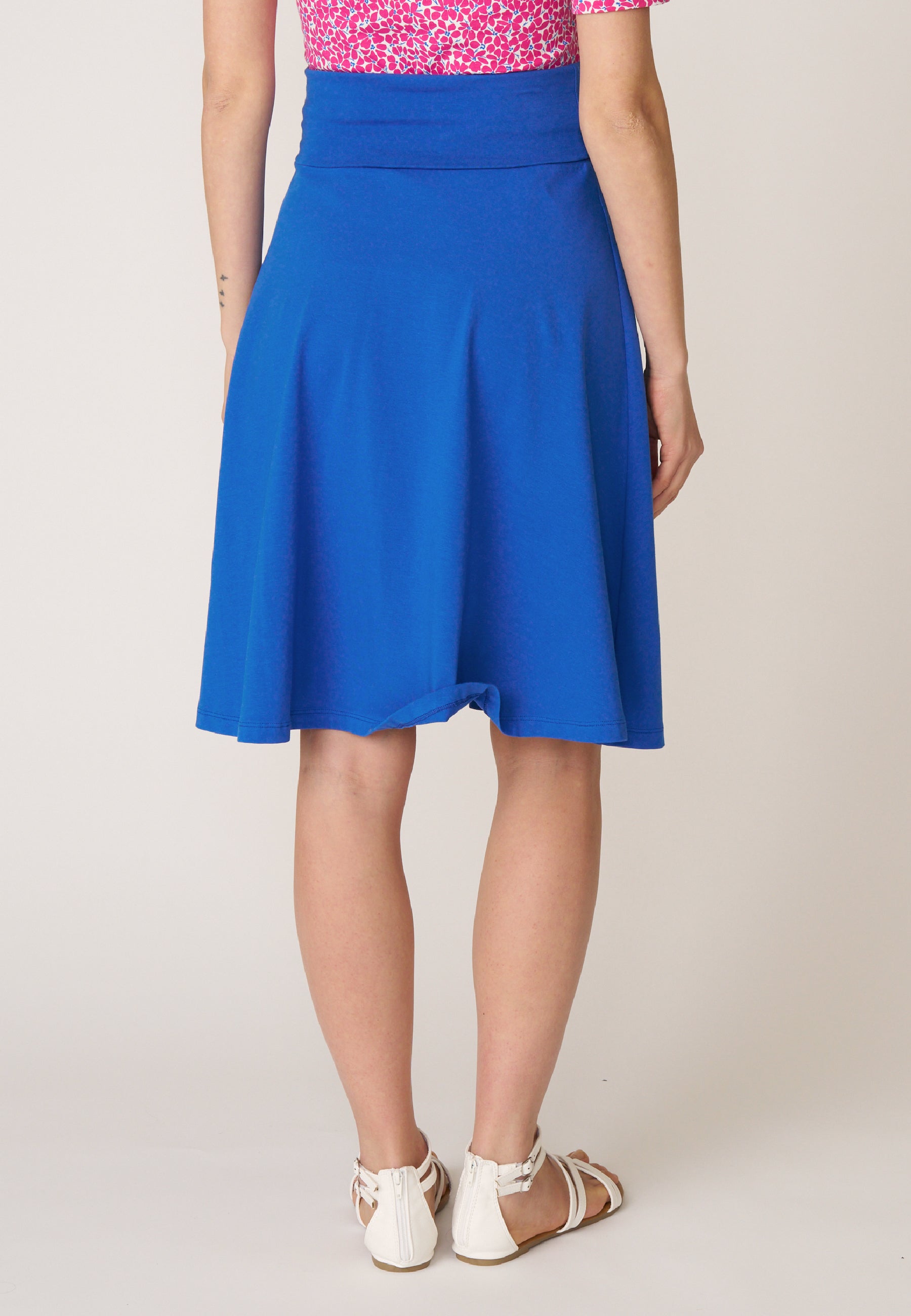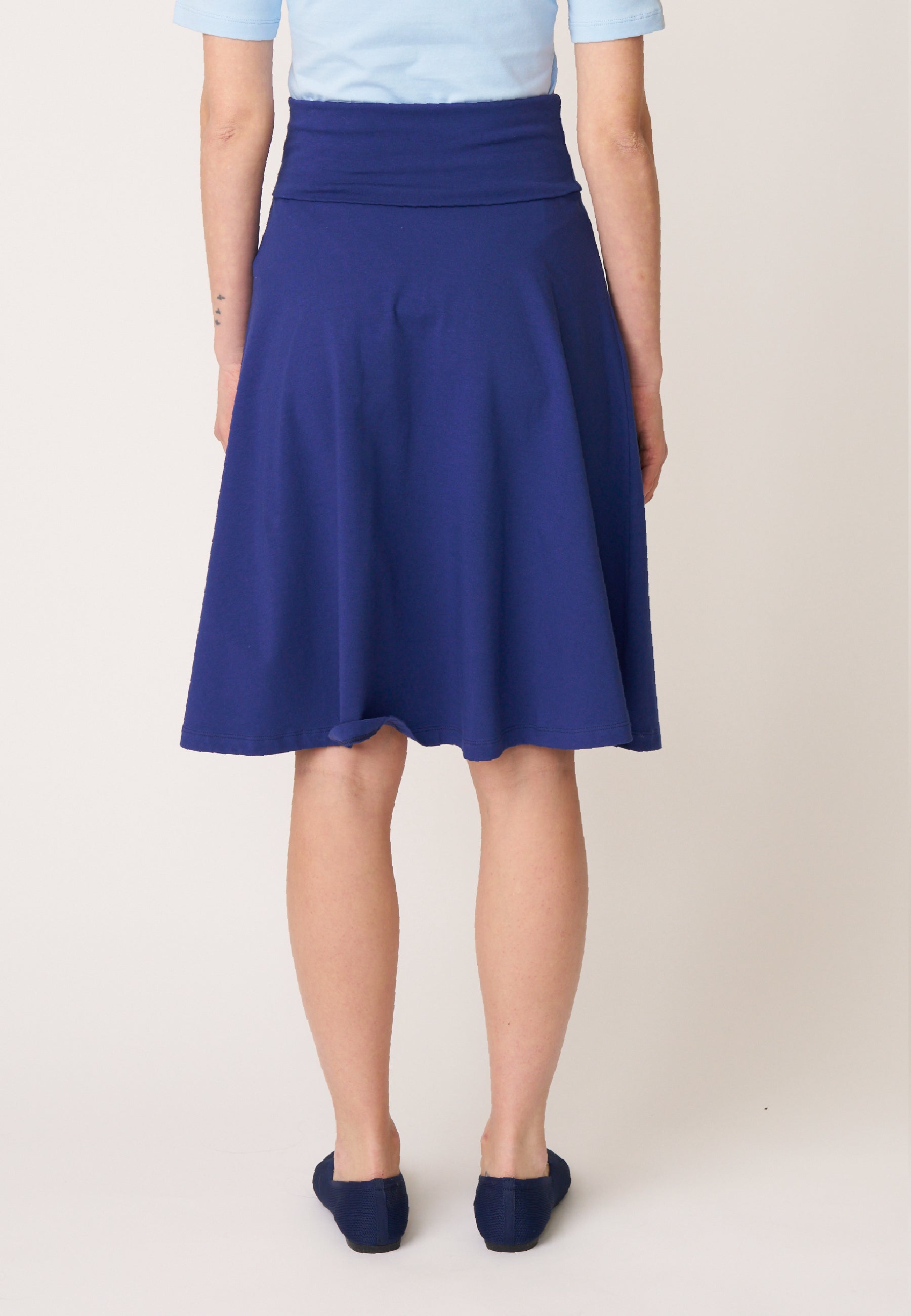Unser Klassiker Rock Doreen besticht seit vielen Saisons aufgrund seines praktischen und schlichten Designs. Das Besondere an dem knielangen Rock mit ausgestelltem Saum ist der hohe, elastische Bund, der sich vielseitig einsetzen lässt und somit die Länge und die Bundform variiert.