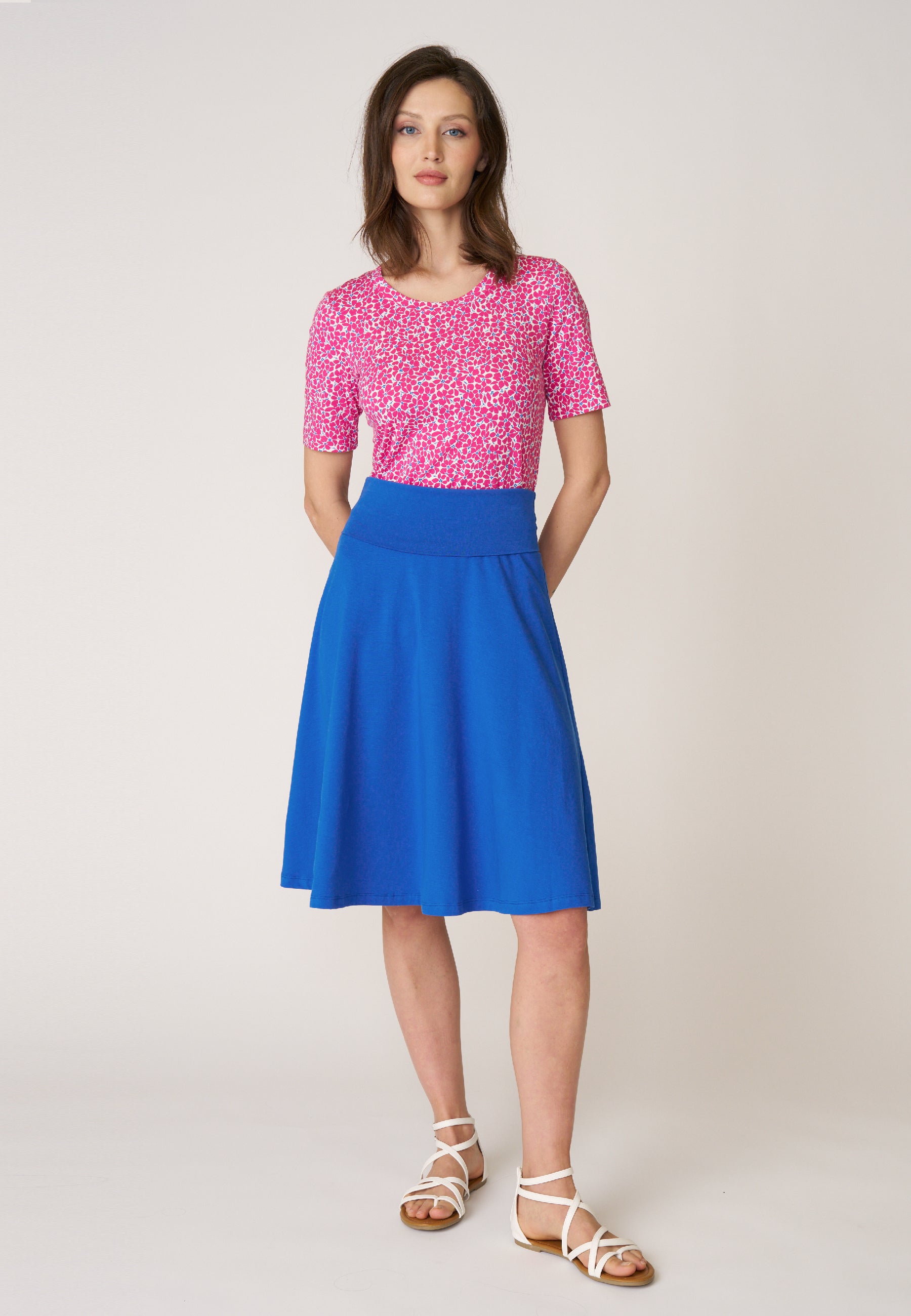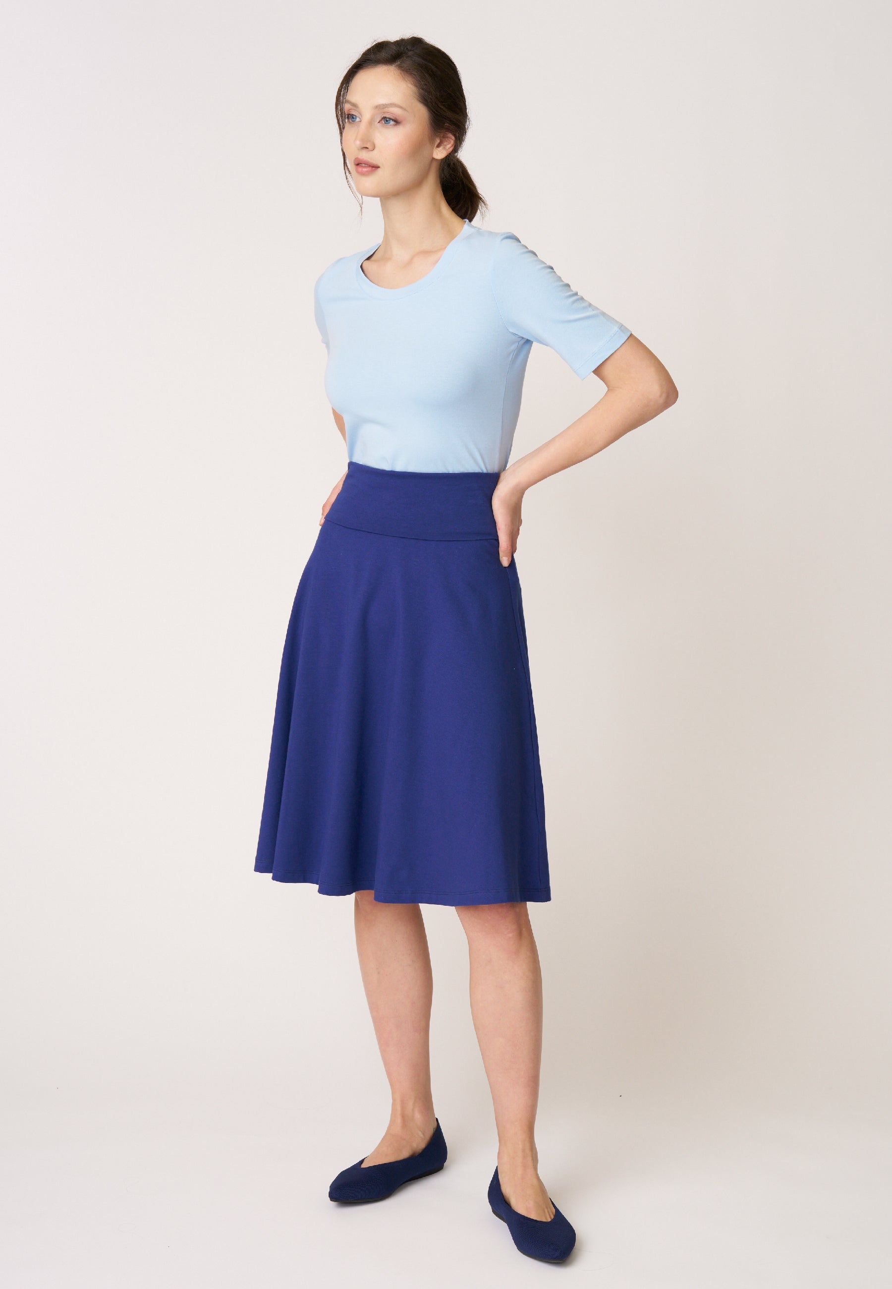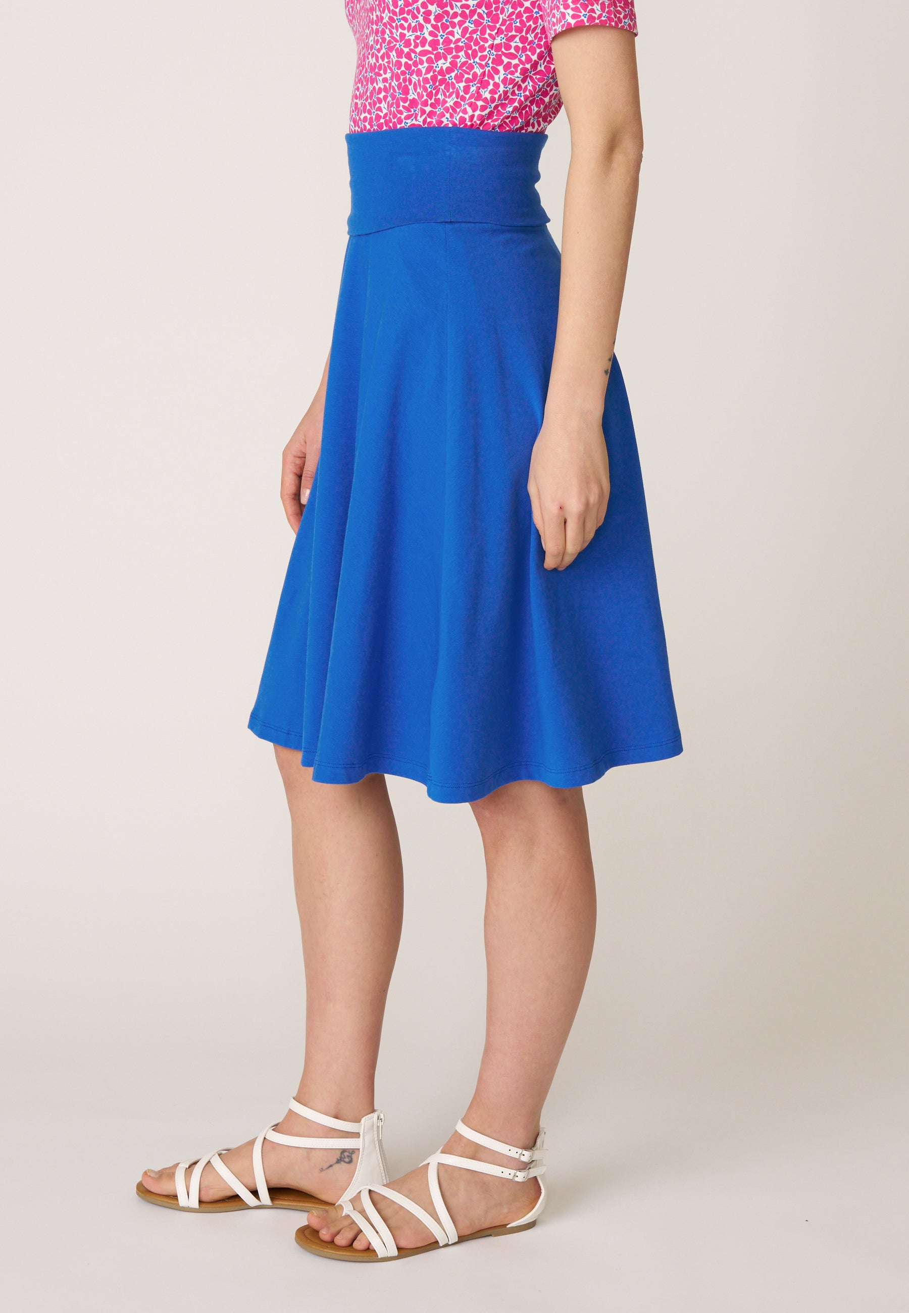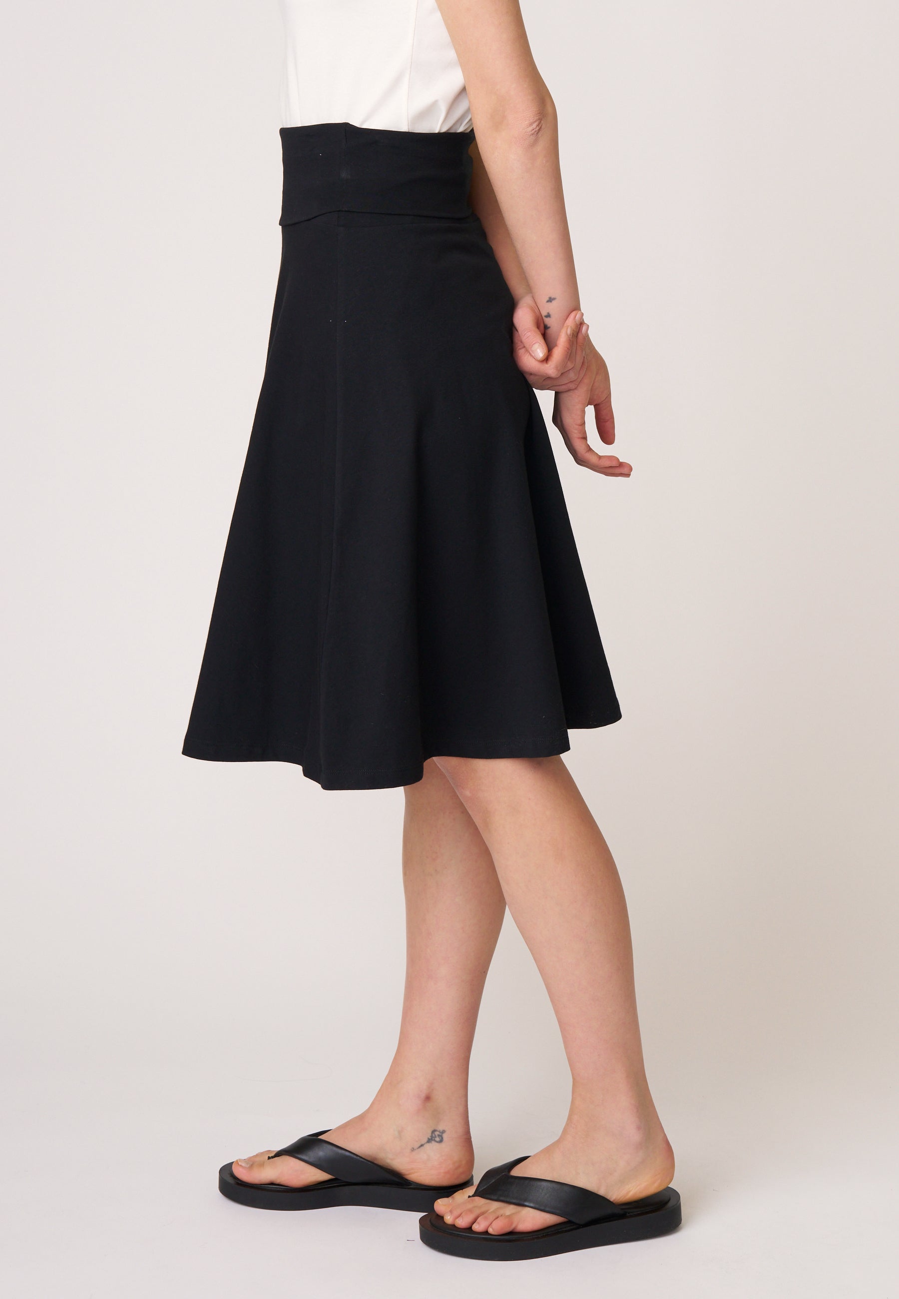 Unser Klassiker Rock Doreen besticht seit vielen Saisons aufgrund seines praktischen und schlichten Designs. Das Besondere an dem knielangen Rock mit ausgestelltem Saum ist der hohe, elastische Bund, der sich vielseitig einsetzen lässt und somit die Länge und die Bundform variiert.
