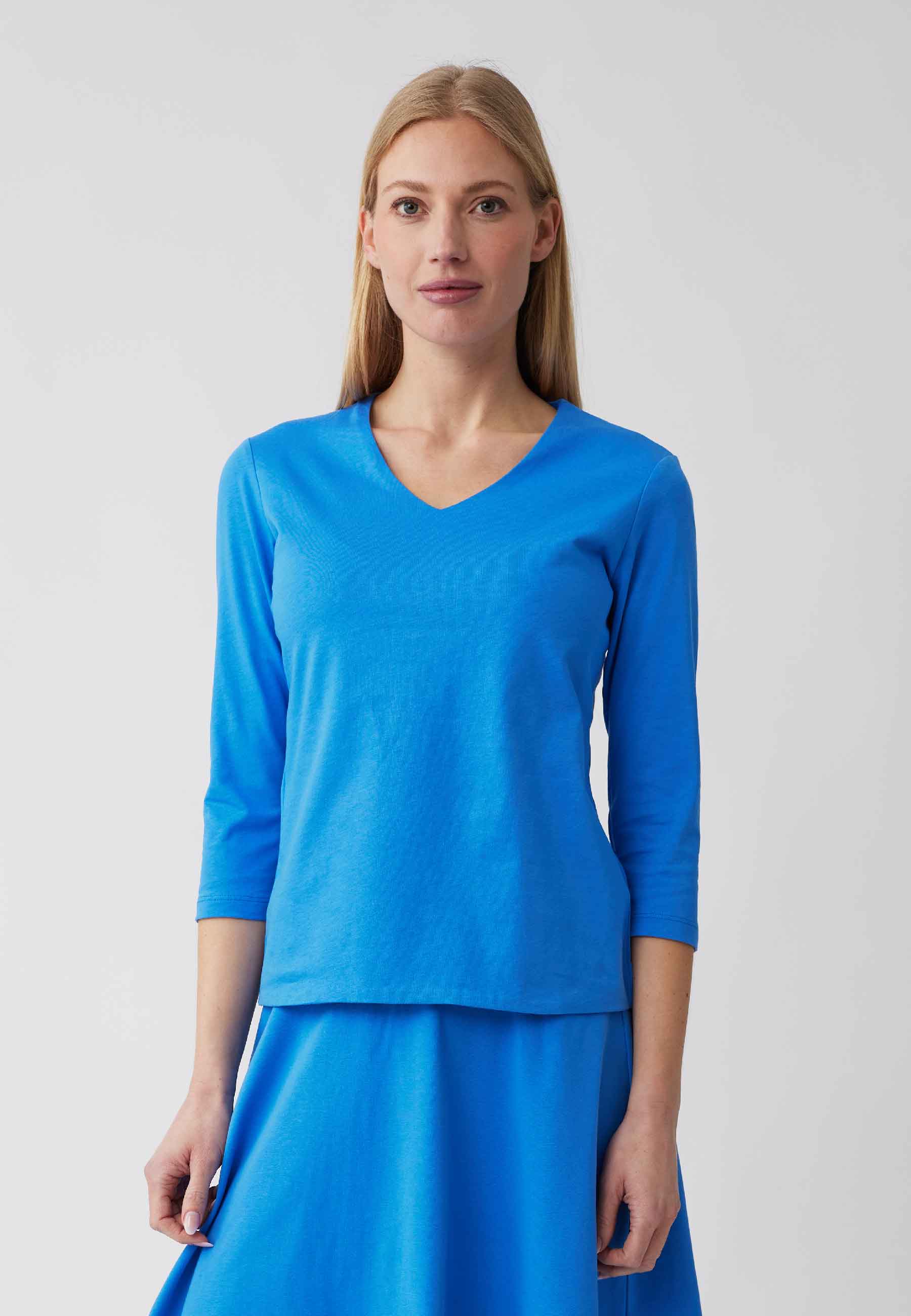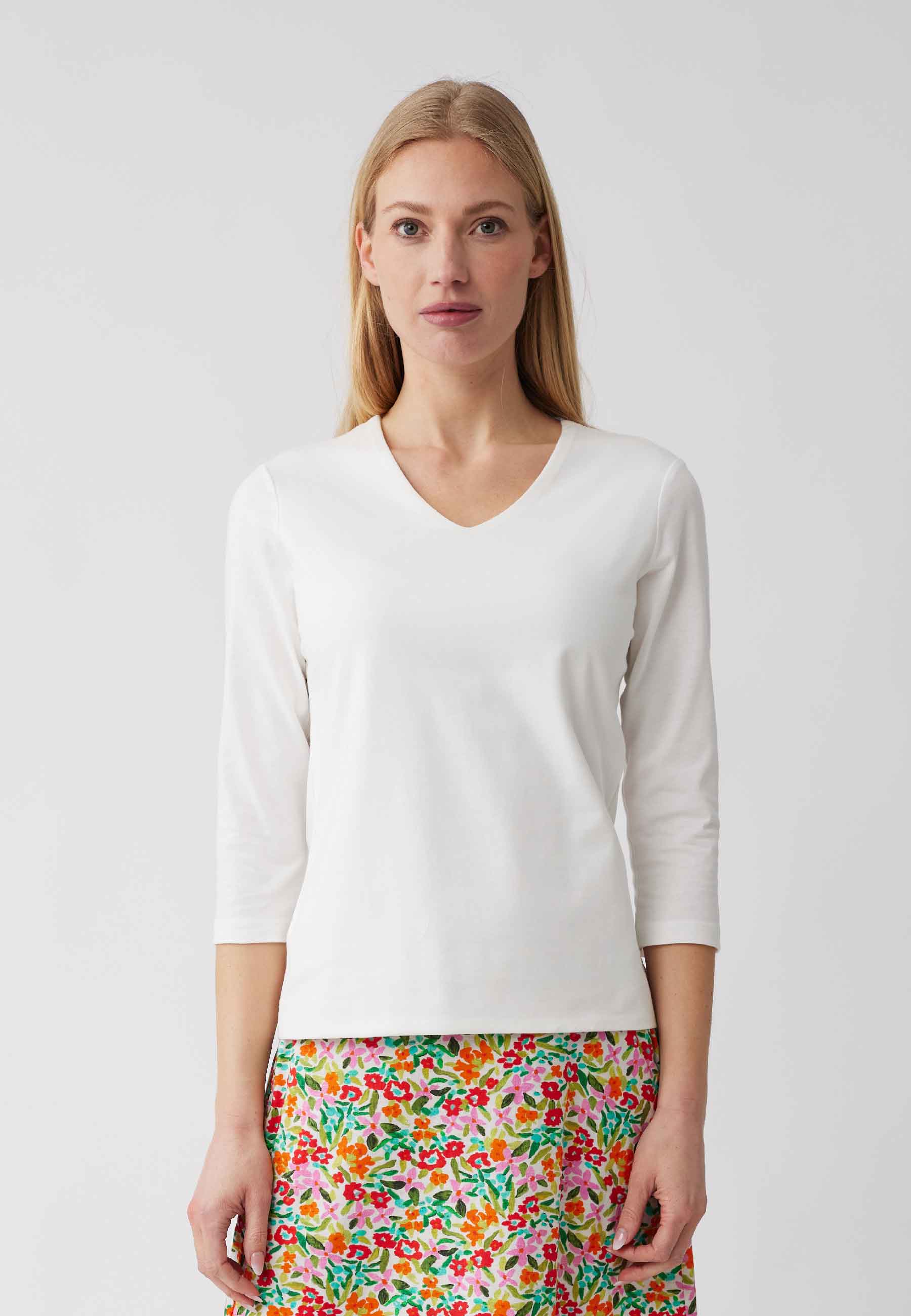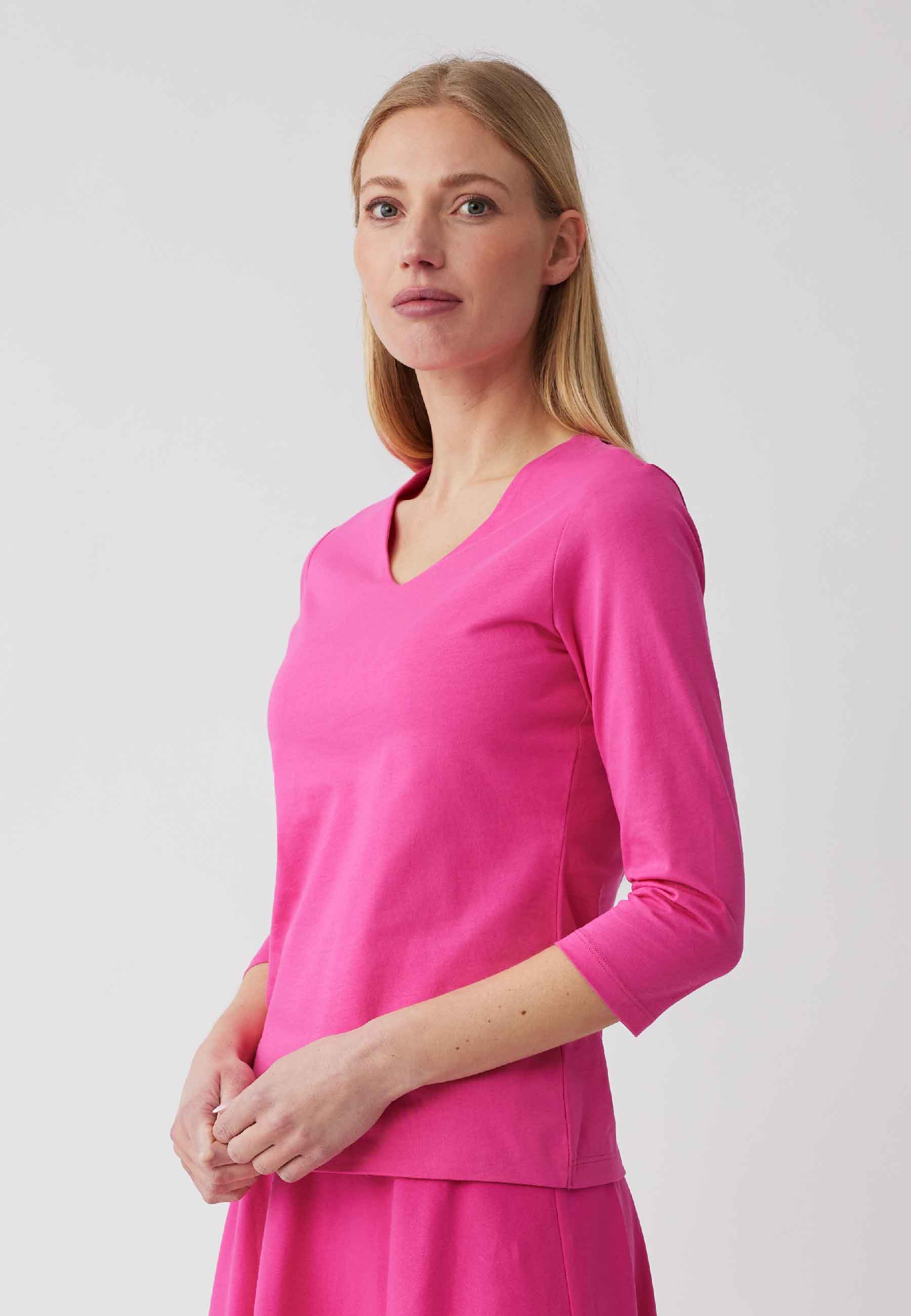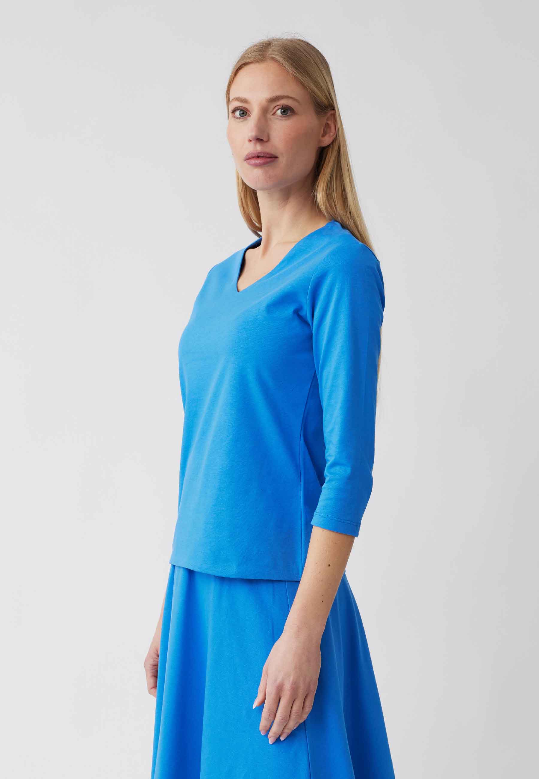 Ein zeitloser Klassiker ist unser V-Neck Shirt Mara, dass auch in dieser Saison mit einer doppeltern Verarbeitung im Vorderteil gefertigt wurde. Vor allem bei hellen Farben sorgt diese Verarbeitung für ein blickdichtes Oberteil und besticht mit dezenten und schlichten Abschlüssen am Hals und Saum. Der hochgeschnittene V-Neck Ausschnitt und der ¾ Ärmel bringen eine gewisse Souveränität mit sich.