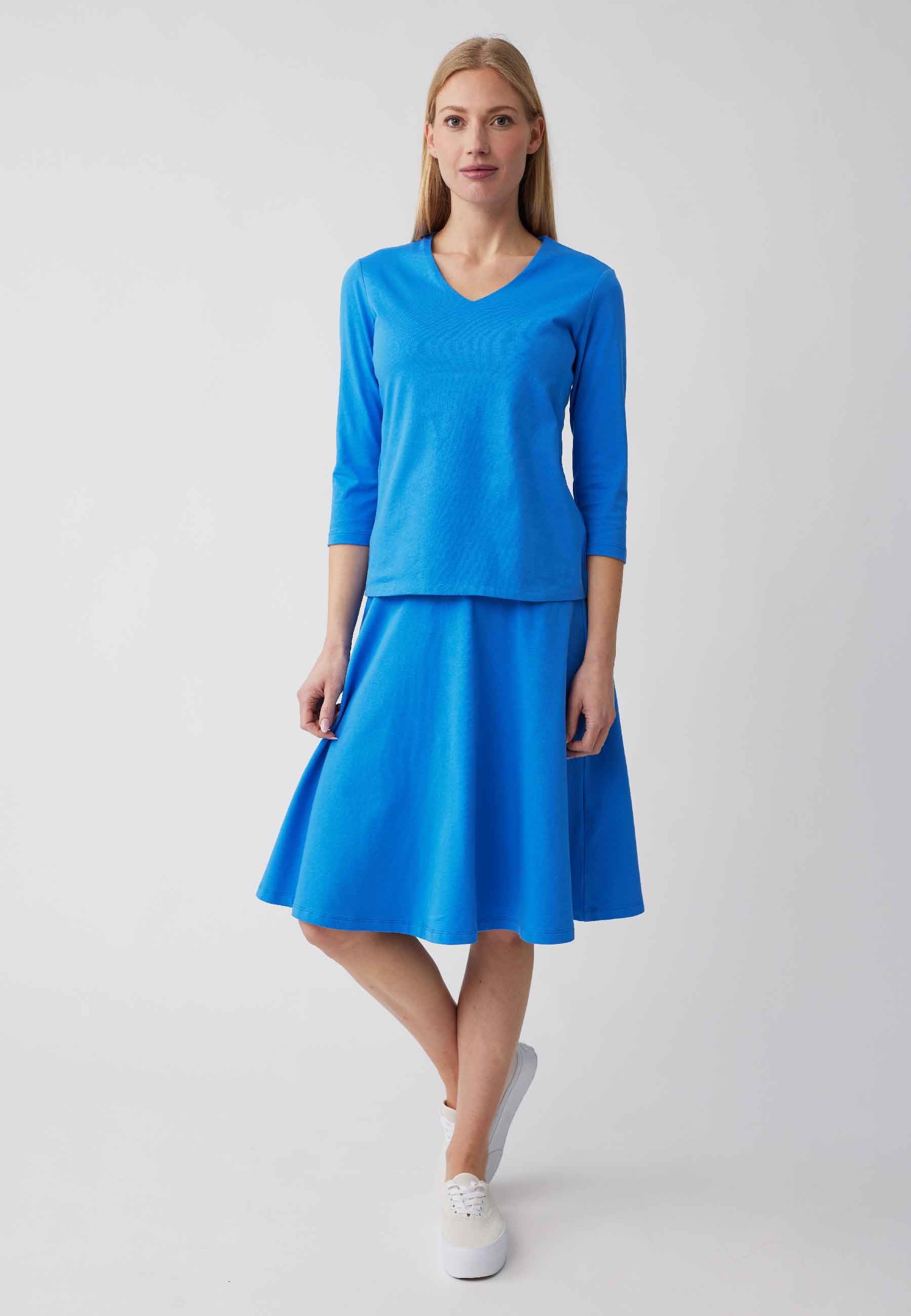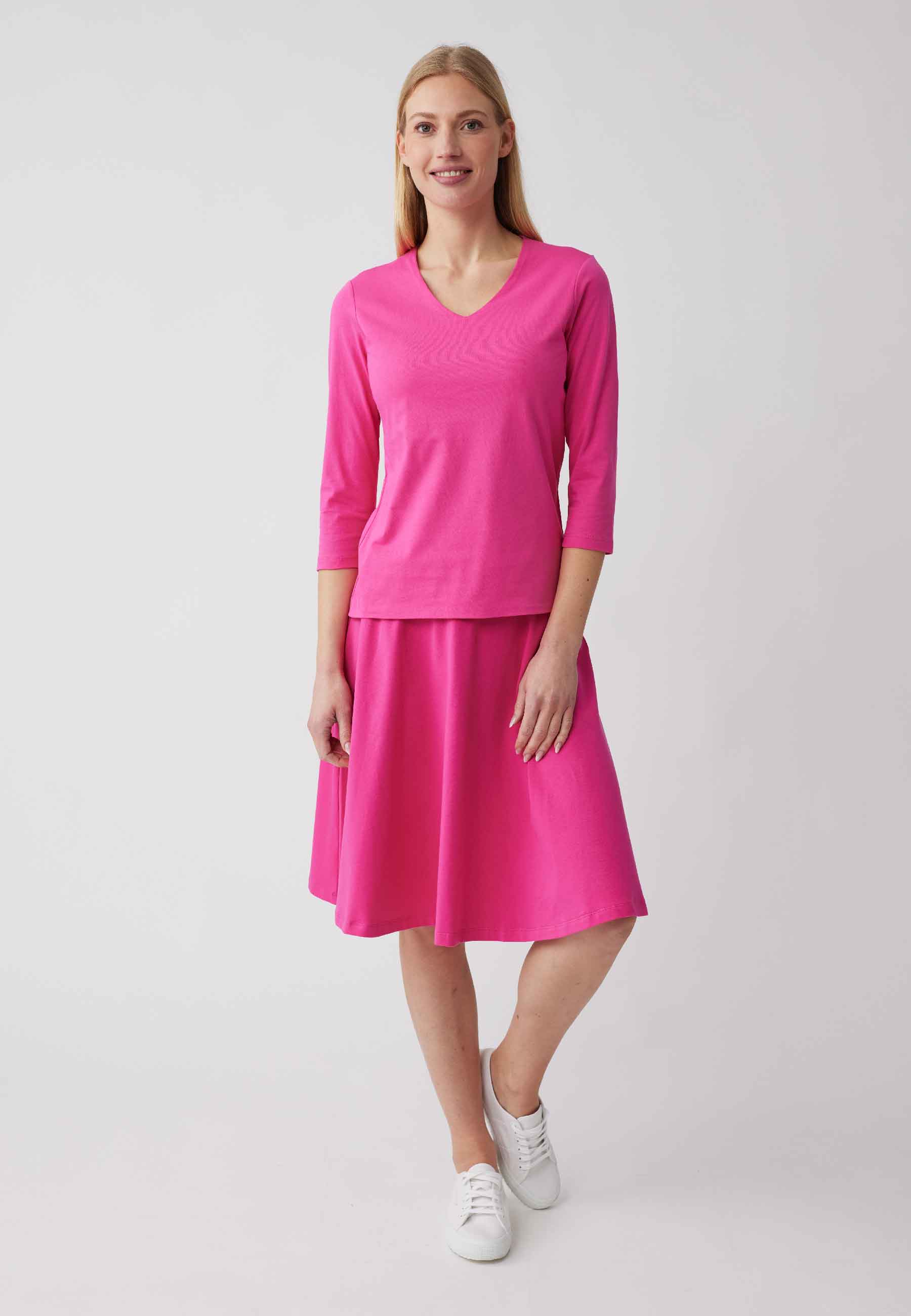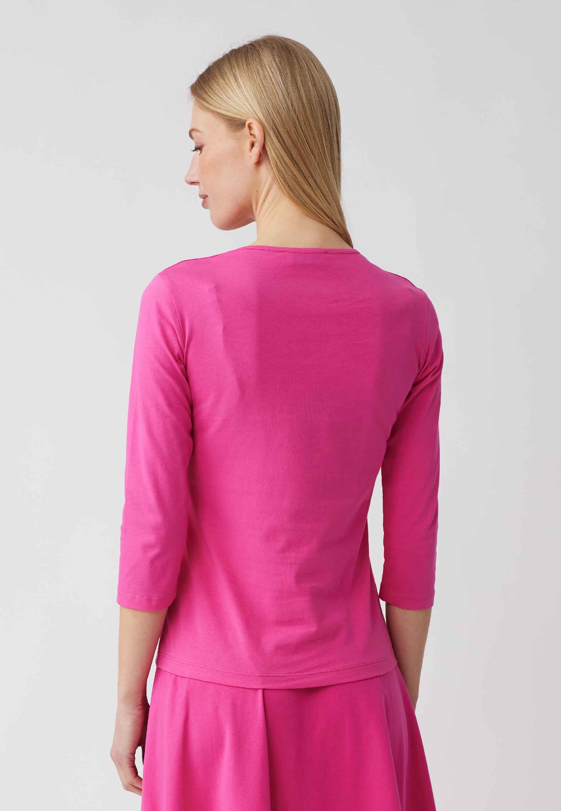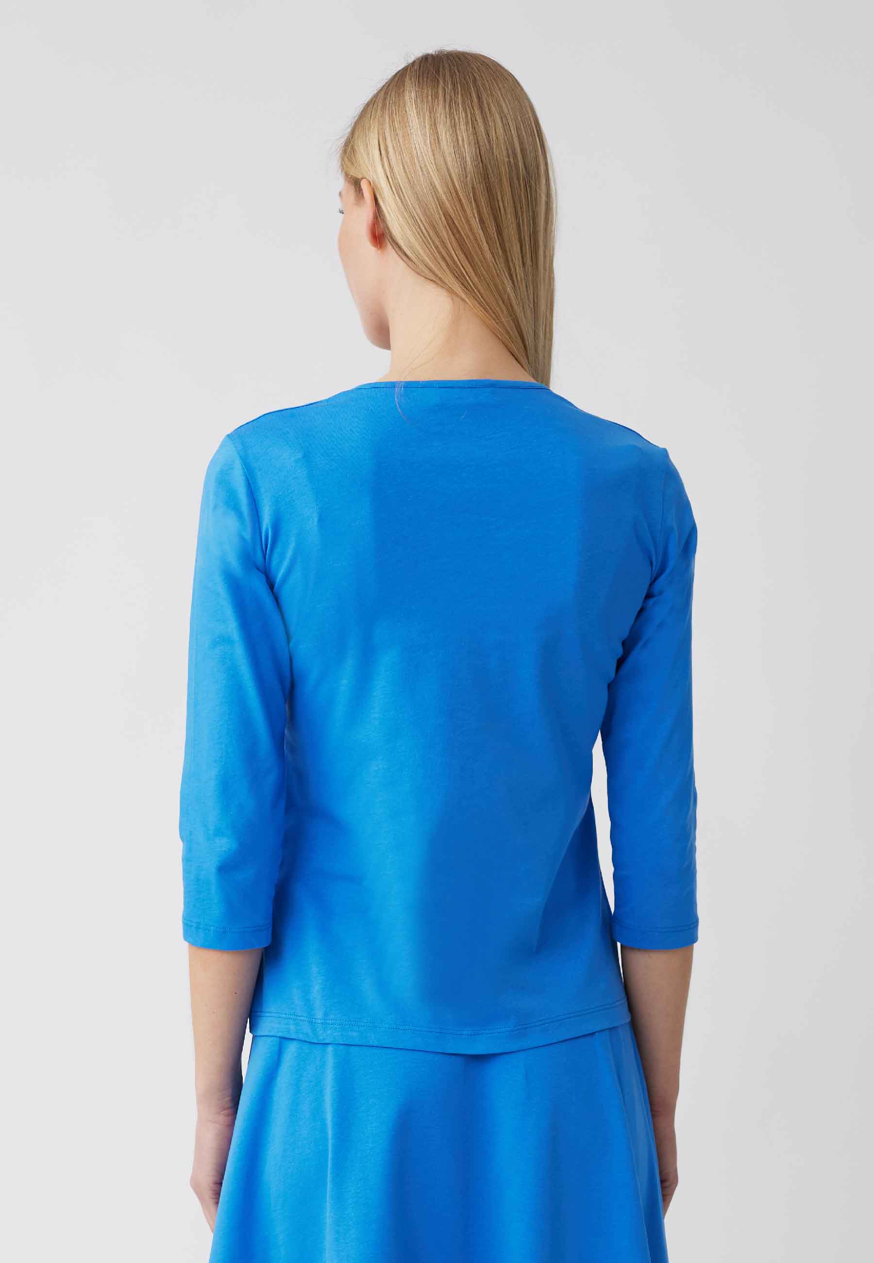 Ein zeitloser Klassiker ist unser V-Neck Shirt Mara, dass auch in dieser Saison mit einer doppeltern Verarbeitung im Vorderteil gefertigt wurde. Vor allem bei hellen Farben sorgt diese Verarbeitung für ein blickdichtes Oberteil und besticht mit dezenten und schlichten Abschlüssen am Hals und Saum. Der hochgeschnittene V-Neck Ausschnitt und der ¾ Ärmel bringen eine gewisse Souveränität mit sich.